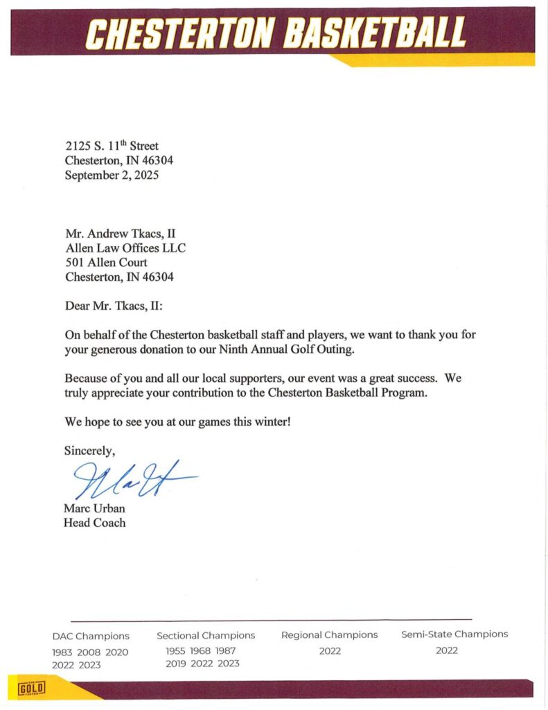 Allen Law Group considers it an honor to be able to contribute both as a firm, and individually as attorneys and support staff within the firm, to the community in Indiana and Illinois. The firm’s commitment to the area we serve is shown by its involvement in a variety of pro bono, civic, and philanthropic endeavors.